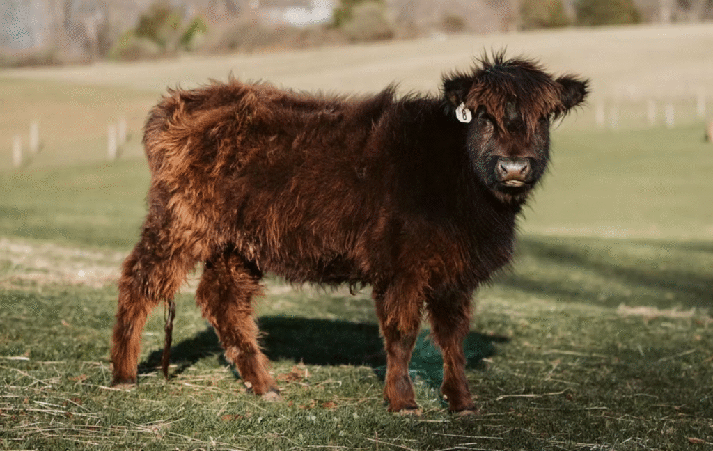 Ariel was born in 2020. She is 100% registered Scottish Highland. She has great confirmation, fantastic hair, and a wonderful disposition. She is super friendly and enjoys treats from all the farm visitors! We suspect she will mature out around 43″ tall.