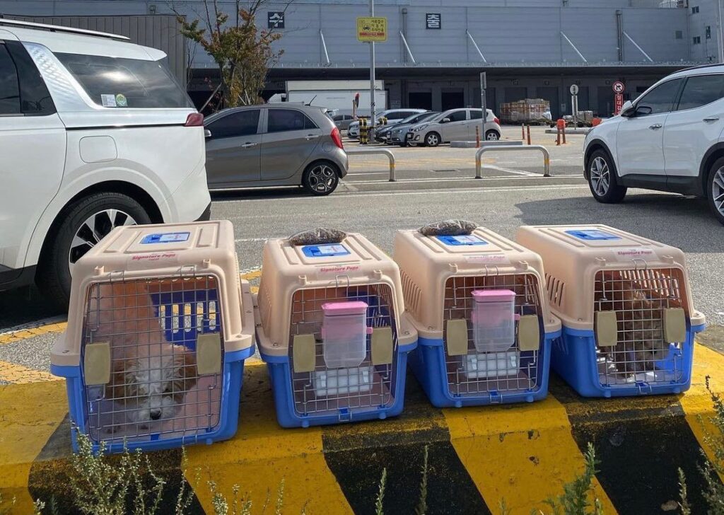 Crates include food, water, and potty pads to ensure your puppy stays clean and comfortable.